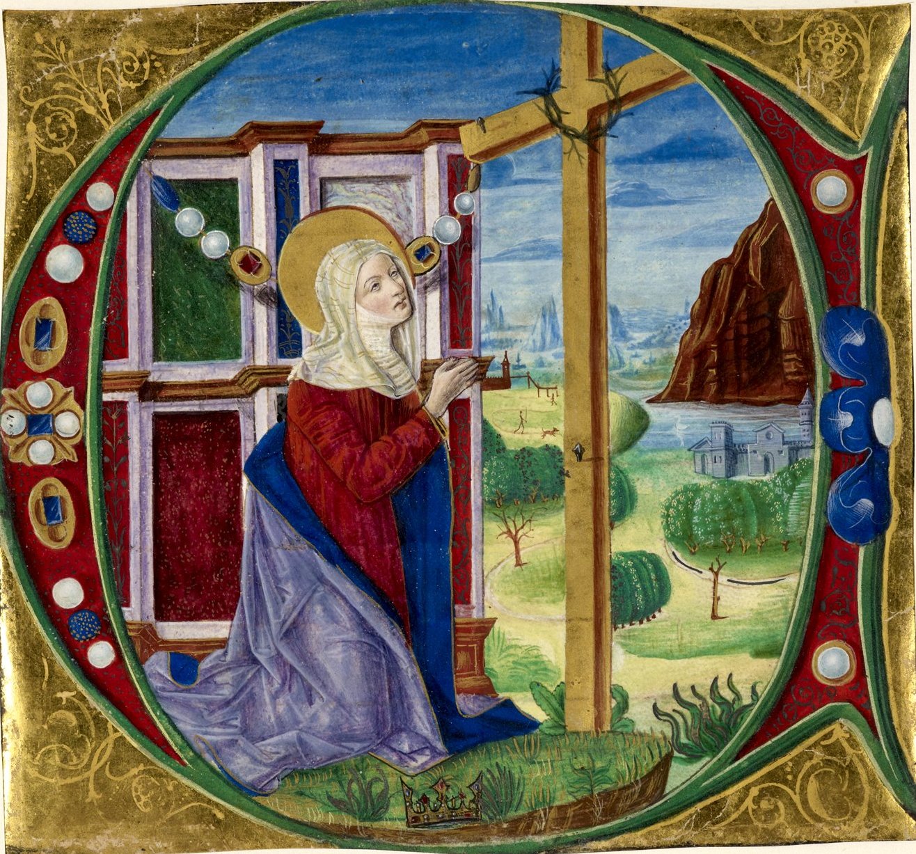 Historiated initial ‘C’ of Helen praying before the Cross. On the reverse, two four-line red staves, musical notation and text ‘…cut docuit /â¦lo’.
