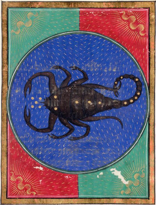 “Scorpio”, illumination from the “Book of Hours”, ms. G. 14, c. 15r, 1473, Morgan Library, New York.