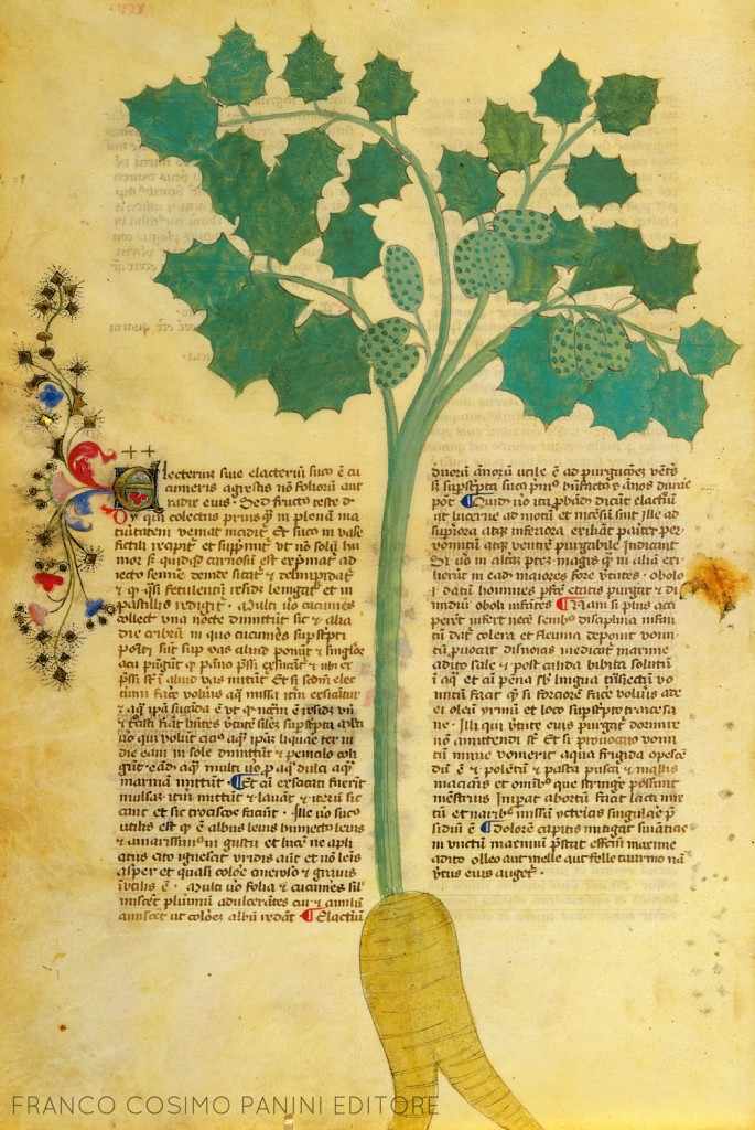 "Il succo del cocomero agreste è detto anche eletterio. Secondo Dioscoride si raccolgono i frutti prima della completa maturazione, si tagliano a metà e il succo si fa scendere in un vaso gettando via la parte carnosa e i semi. Per provare se il succo è buono, alcuni dicono che si deve avvicinare una lucerna e prima di spegnerla la si fa sfavillare di sopra e di sotto; ciò sta a indicare che è valido. Purga gli adulti alla dose di un obolo e i fanciulli alla dose di mezzo obolo. Se presa a dose maggiore può portare a morte."