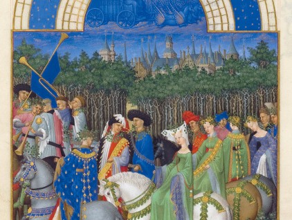 "Mese di maggio", miniatura tratta dalle 'Très Riches Heures del Duca di Berry' (XV secolo), Musée Condé, Castello di Chantilly. Gentiluomini in pellanda e gentili dame con abiti verde vivo, cinti da corone o collane…