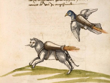 "Gatto e colomba trasportano bombe incendiarie dirette contro i nemici", illustrazione tratta dal Buch von den probierten Künsten (1535), Universitätsbibliothek, Heidelberg.