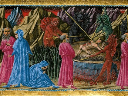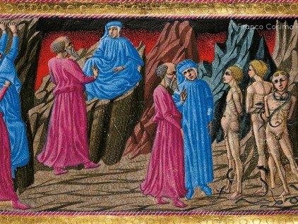 Inferno, Canto XXIV. Dopo aver faticosamente raggiunto la settima bolgia (a sinistra e al centro), i due poeti incontrano le anime dei ladri, che "con serpi le man avean legate". Quando i dannati sono morsicati…