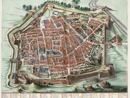 "Personificazione dell'Italia", illustrazione tratta da 'Voyages et aventures de Ch. Magius' (1578), Bibliothèque nationale de France, Parigi. In senso orario da sinistra: 1. Pesaro 2. Sacile 3. Pola 4. Capodistria 5. Venezia 6. Ferrara 7. Bologna…