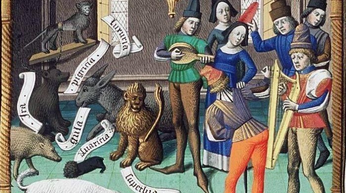 "L'empietà dei pagani: i Romani si dilettano tra i peccati, simboleggiati dai sette…