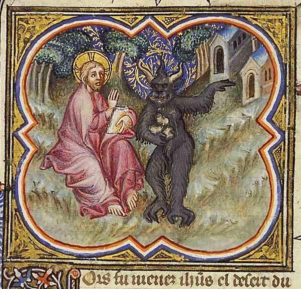 "Satana tenta Gesù nel deserto: «Se sei Figlio di Dio, di' che questi sassi diventino pane»", miniatura tratta dalla 'Grande Bible Historiale Complétée' (1371-1372), Koninklijke Bibliotheek, L'Aia.
