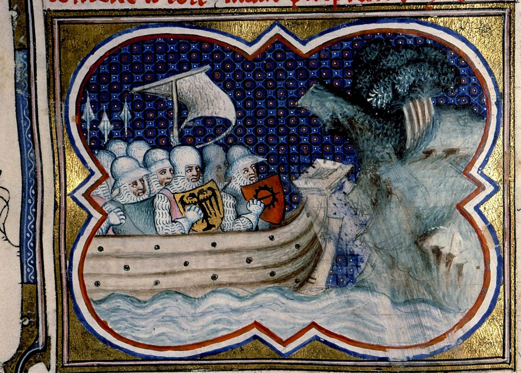 “Flotta spartana di Cleonimo approda in Italia”, miniatura tratta dal manoscritto “Ab Urbe condita” di Tito Livio, ms. 0777 c. 156, circa 1370, Bibliothèque Sainte-Geneviève, Parigi.