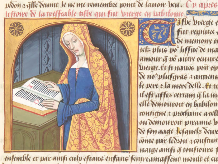 “Tisbe”, miniatura tratta dal manoscritto “De Mulieribus Claris”, decorato da Robinet Testard, ms. Français 599, c. 13r, 1488-1496, Bibliothèque nationale de France, Département des Manuscrits, Parigi.