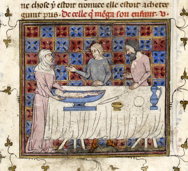 "Maria figlia di Eleazaro offre ai sediziosi il corpo del figlio cotto", miniatura tratta dal 'Miroir Historial' di Vincent de Beauvais (Francia, 1370-1380), Bibliothèque nationale de France, Parigi.