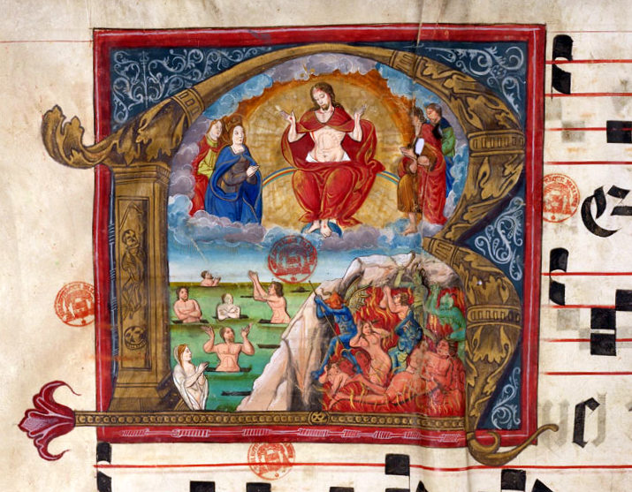 Iniziale "R" (Requiem) raffigurante "Il Giudizio Universale", miniatura tratta da Graduale (1549 - ultimato nel XVIII secolo), Bibliothèque Mazarine, Parigi.