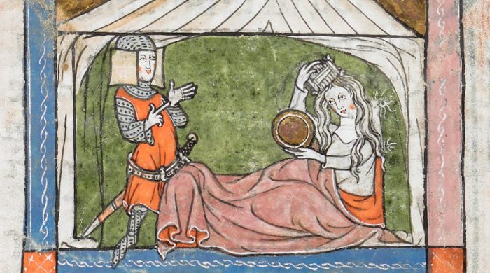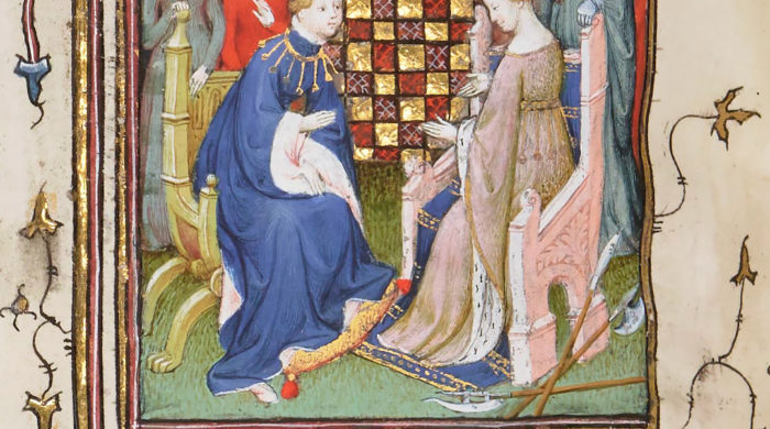 Miniatura tratta dal codice De consolatione philosophiae (1477), ms. Harley 4338, British Library, Londra, c. 1v (dettaglio).