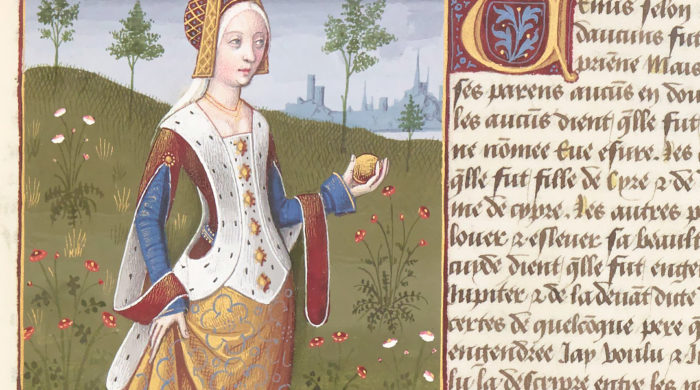 Illumination from the manuscript De consolatione philosophiae (1477), ms. Harley 4338, Britsh Library, London, c. 1v (detail).
