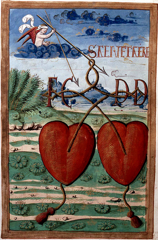 "Cupido scaglia due frecce verso una coppia di cuori", miniatura tratta dalle 'Orationes' (1510), Bibliothèque municipale, Clermont-Ferrand.