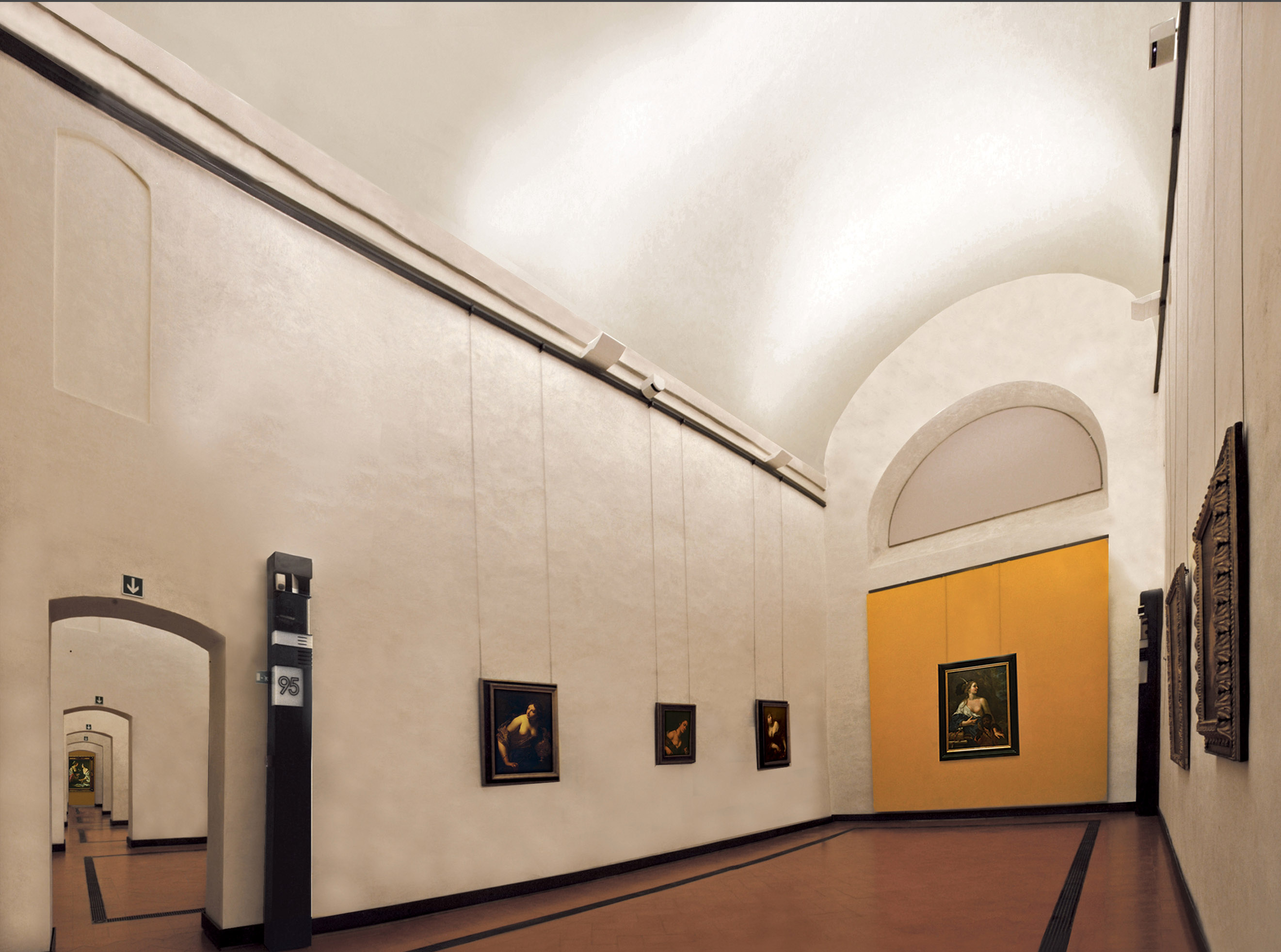 Anche qui sarà mantenuto il criterio di introdurre una nota cromatica, un pannello colorato su cui esporre le opere più significative: in luogo del rosso cremisi caratteristico del Cinquecento mediceo, troveremo qui il giallo ocra che riecheggia gli splendori delle tappezzerie barocche. Contemporaneamente, sono stati effettuati importanti e imprevisti lavori di consolidamento delle volte di due sale al primo piano del lato di ponente, che hanno interessato anche le strutture delle soprastanti sale espositive al secondo piano. Sono inoltre già stati impiantati due nuovi cantieri, ancora al secondo piano, che consentiranno a breve la riapertura di sei sale della Galleria storica, completamente restaurate, rinnovate e riallestite.