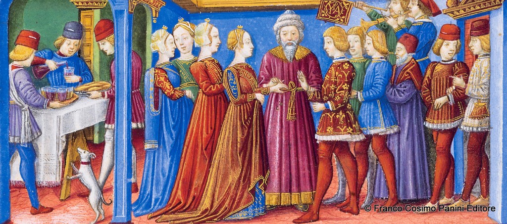 Il viaggio inizia con "Il matrimonio di Gioacchino e Anna": benché ambientata a Gerusalemme, la scena evoca ambienti e costumi quattrocenteschi. Il sacerdote tiene le mani degli sposi e Gioacchino infila l’anello al dito della mano sinistra di Anna. Sullo zuppone dello sposo è ripetuta l’iniziale Y di Yoachin, mentre il nome di Anna è ricamato in lettere dorate sulla veste della sposa. Nell’ambiente accanto, si mesce il vino del banchetto: il paggio incaricato di servire ha un telo annodato intorno al busto. La miniatura è tratta dal Leggendario Sforza-Savoia (Milano, 1476), Biblioteca Reale, Torino.