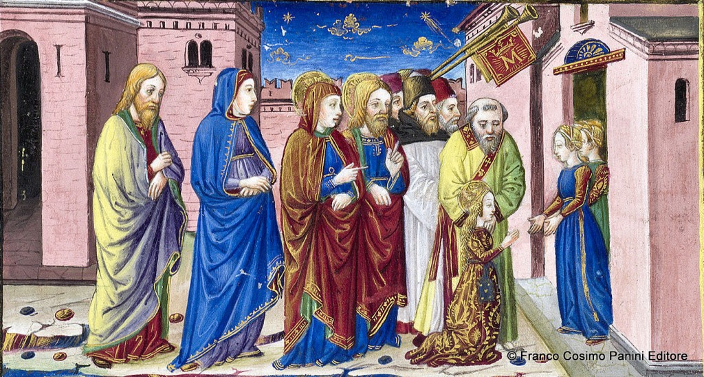 L’ingresso al Tempio: Maria si inginocchia sulla soglia davanti alle undici vergini che servono il Tempio fino all’età del matrimonio (ma qui ne scorgiamo solo due) e alle quali è fatto divieto di uscire.