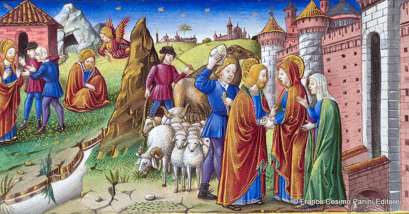 L’incontro alla Porta Aurea: un terzo messaggio celeste, ricevuto in sogno, induce l’esitante Gioacchino a rompere gli indugi e a mettersi in cammino per Gerusalemme dove, trenta giorni dopo, incontra Anna alla Porta Aurea, che lo abbraccia “tenerissimamente”, in compagnia di una donna. È in questo momento che viene concepita Maria.