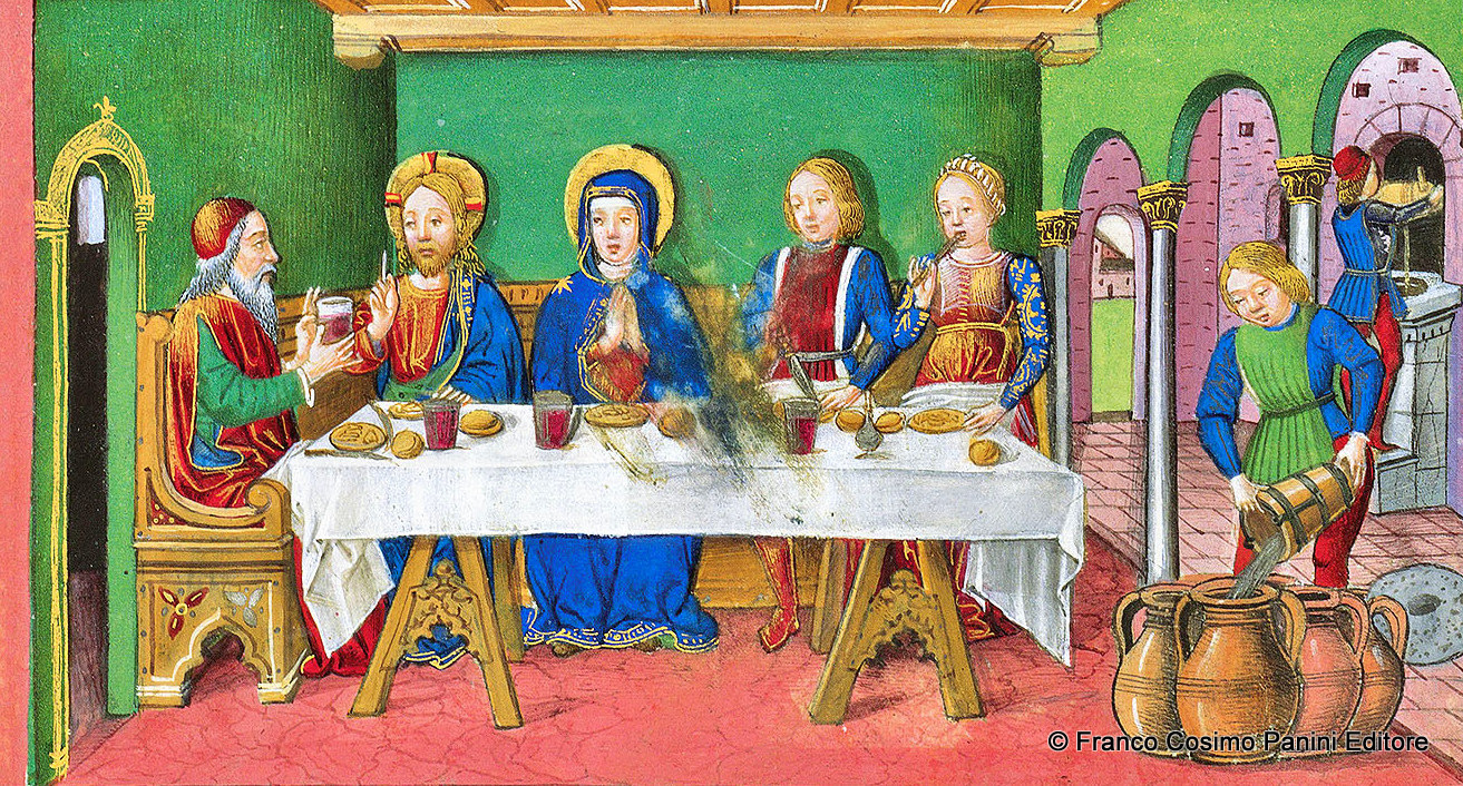 Sollecitato dalla Madre, durante un banchetto di nozze a Cana in Galilea, Cristo trasforma l’acqua in vino: è il primo miracolo. Sulla destra, un servo riempie le “ydrie” dell’acqua attinta a un pozzo.