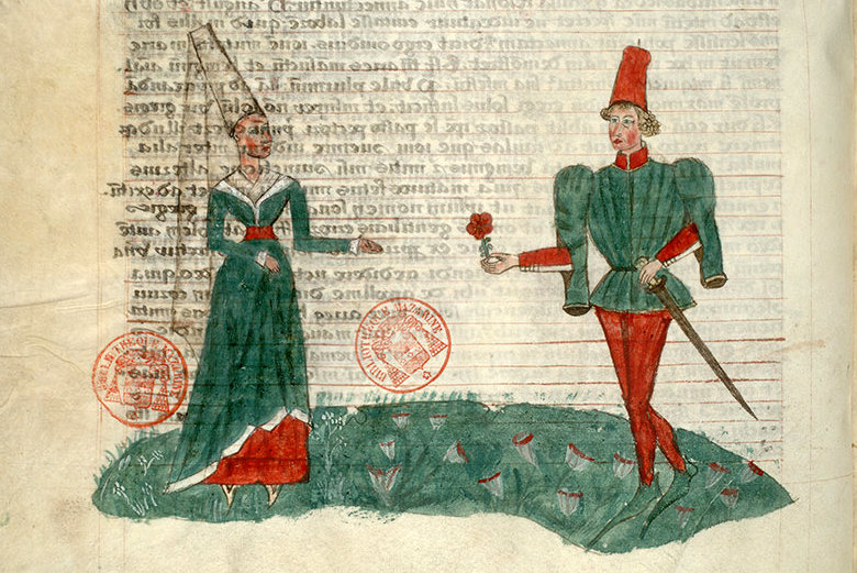 "Uomo offre un fiore a una donna", miniatura tratta da 'De Genealogiis deorum gentilium' (XV secolo), Bibliothèque Mazarin, Parigi.