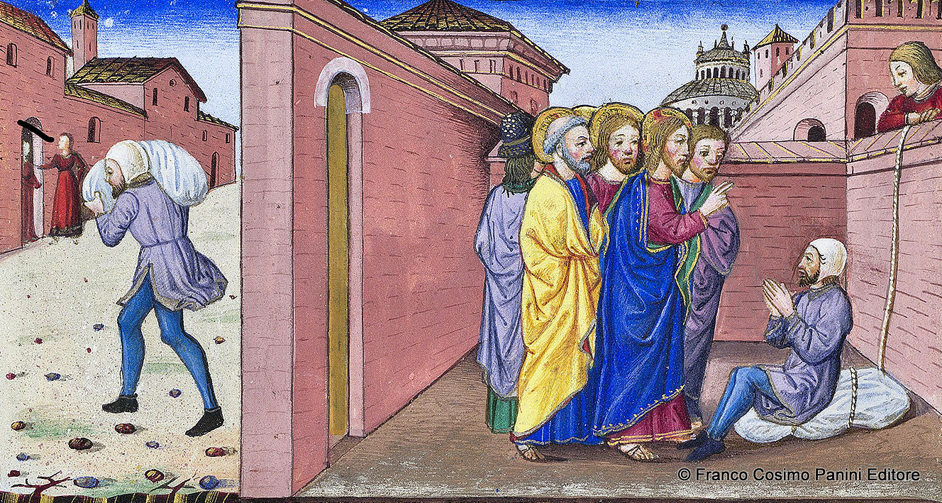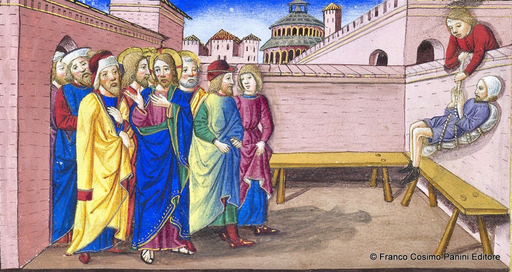 Cristo suscita scandalo perché lo guarisce e perdona i suoi peccati. A sinistra, il miracolato rientra a casa portando con sé il lettuccio.