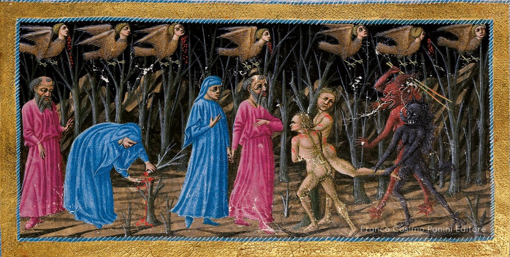 Inferno, Canto XIII. Un'atmosfera cupa e angosciante caratterizza la visita di Dante al bosco dei suicidi, le cui anime sono tramutate in piante divorate dalle mostruose arpie. Sulla sinistra è raffigurato il poeta subito dopo aver troncato un ramo, secondo il suggerimento di Virgilio, per poter verificare il prodigio della fuoriuscita del "sangue bruno". A destra invece due dannati sono inseguiti da demoni dall'aspetto così terrificante che spaventano il nostro Dante, cui Virgilio tiene la mano per rincuorarlo.