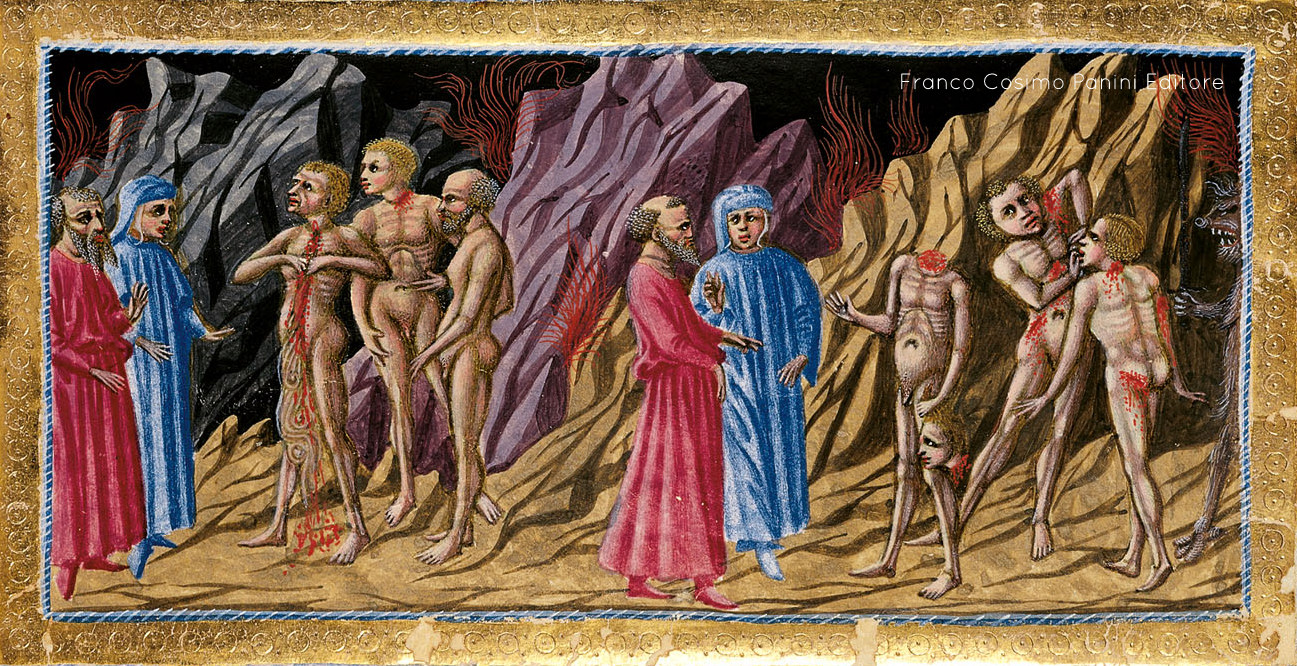 Inferno, Canto XXVIII. Ciò che vedono i due poeti è raccapricciante: i dannati camminano mutilati, straziati dalla spada di un diavolo. Sono i seminatori di discordia, tra i quali Mamometto (con le viscere che fuoriescono dalla pancia tagliata), Alì (genero di Maometto) e fra Dolcino (benché al tempo del viaggio dantesco fosse ancora in vita).