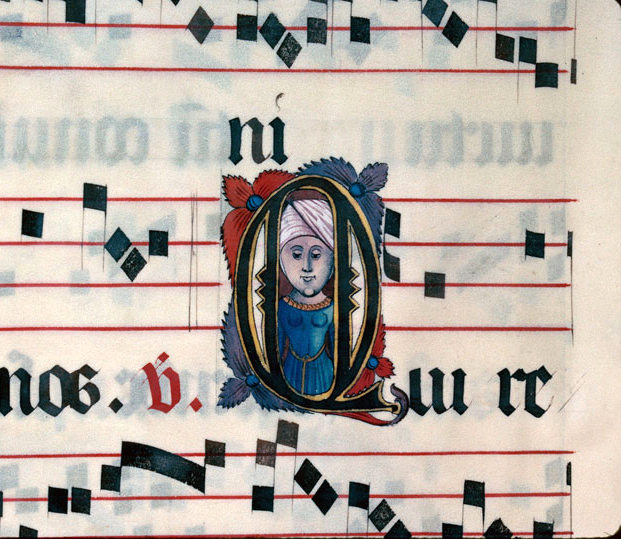Iniziale “Q” raffigurante una figura femminile, miniatura tratta dal ‘Graduale di Saint-Dié’ (1504-1510), Bibliothèque municipale de Saint-Dié-des-Vosges.