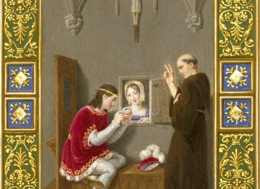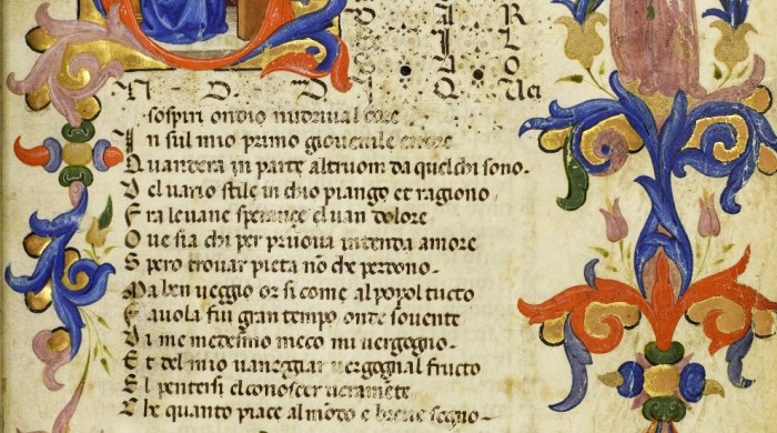 Pagina miniata tratta dal 'Canzioniere', con la poesia "Voi ch'ascoltate in rime sparse…