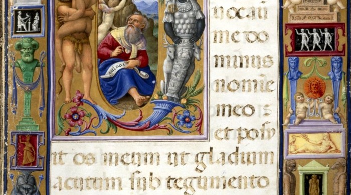 Pagina miniata da Giulio Clovio con iniziale raffigurante san Zaccaria e bordi con…