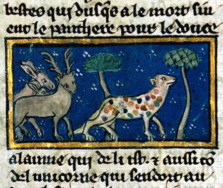 "Pantera, cervo e altri animali", miniatura tratta da 'Raccolta letteraria' (inizio del XIV secolo), Bibliothèque municipale, Digione.