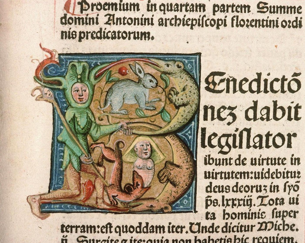 Iniziale "B" (Benedictionem dabit legislator) con giullare, animali e creature fantastiche. Illustrazione tratta dalla 'Summa theologica' di Antoninus Florentinus (fine XV secolo), Bibliothèque municipale, Avignone.