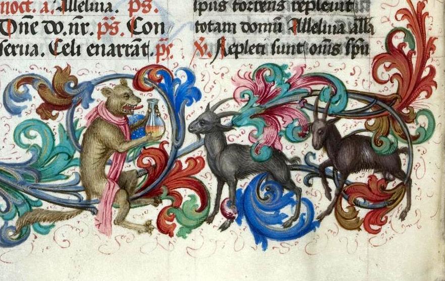 "L'imbonitore attira le capre", miniatura tratta da Breviario abbaziale (Salem, 1494-1495), Biblioteca dell'Università di Heidelberg.