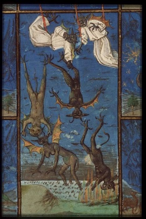 “The Fall of rebel angels”, illumination from the “Bible moralisée”, ms. KB 76 E 7, c. 1r, 15th century, National Library of Holland, The Hague.