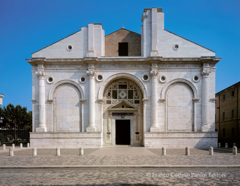 Il Tempio, costruito a partire dal 1450 sulla base di una chiesa francescana del XIII secolo, ha rappresentato già per i suoi contemporanei un affascinante enigma: edificio sacro o monumento alla potenza del principe? I contrasti tra il neoclassicismo della facciata, opera di Leon Battista Alberti, e l’elegante gotico dell’interno danno vita a un edificio unico al mondo in cui grandi protagonisti dell’arte rinascimentale come Matteo de’ Pasti, Agostino di Duccio, Piero della Francesca hanno lasciato la propria firma (oltre a Giotto, di cui nella chiesa si conserva oggi un Crocifisso risalente al suo soggiorno riminese).