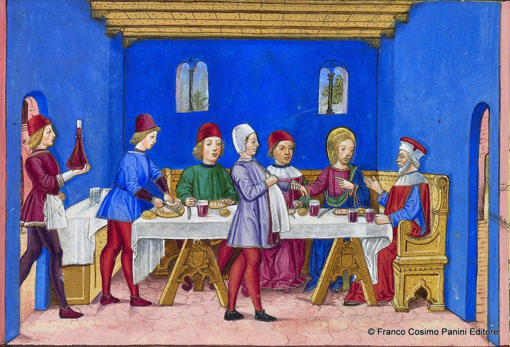 Un sabato, giorno di riposo, a pranzo da un fariseo Cristo guarisce un malato di idropisia, riconoscibile dal ventre gonfio per l’accumulazione di liquidi.