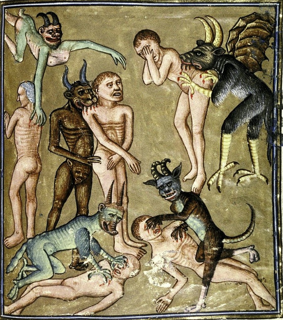 "Diavoli mordono e graffiano alcuni dannati", miniatura tratta dal 'Livre de la Vigne nostre Seigneur' (Francia, 1450-1470), Bodleian Library, Oxford.